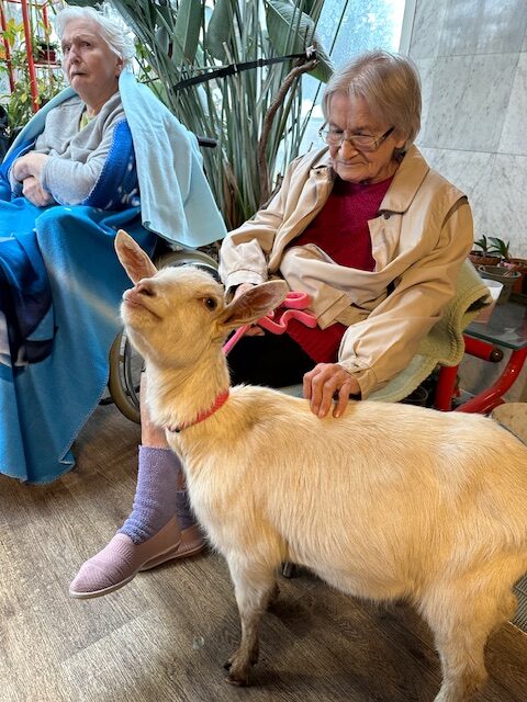 Dnešní odpoledne jsme se teple oblékli a vyrazili do zimní zahrady, kde jsme čekali na příchod zvířátek. Přijela za námi se svou majitelkou, paní Ing. Evou Bukričovou, až z Benešova. Paní Eva nám postupně představila zvířata, se kterými nás přijela potěšit. Začala fenka Safira, koza Kačenka, minihorse Frodo, kocouři Čuk a Gek, slepičky Popelka a Beruška a na závěr kohout Honzík. Ke každému zvířeti nám řekla, kolik mu je let a nějaké další zajímavosti. Zvířátka mohla kolem nás volně pobíhat a my si je mohli pohladit. Paní Eva nás s každým zvířátkem obešla, abychom mu dali pamlsek. Nejzajímavější bylo krmení slepiček, které zobaly zrní z ruky. Bylo to velmi příjemné a slepičky velmi opatrné. Čuk a Gek nám leželi v klíně a koza Kačenka nám ukázala také své kousky. Takovou zooterapii jsme ještě nezažili a byli jsme velmi nadšeni, když jsme se dozvěděli, že paní Eva nás přijede brzy zase navštívit i se zvířátky.