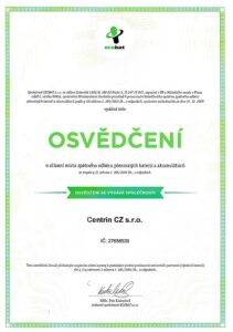 Společnost ECOBAT s.r.o. vydává v říjnu 2016 osvědčení o zřízení místa zpětného odběru přenosných baterií a akumulátorů pro společnost Centrin CZ s.r.o.