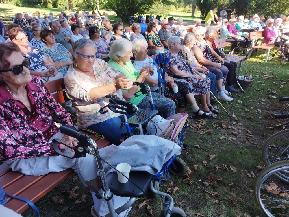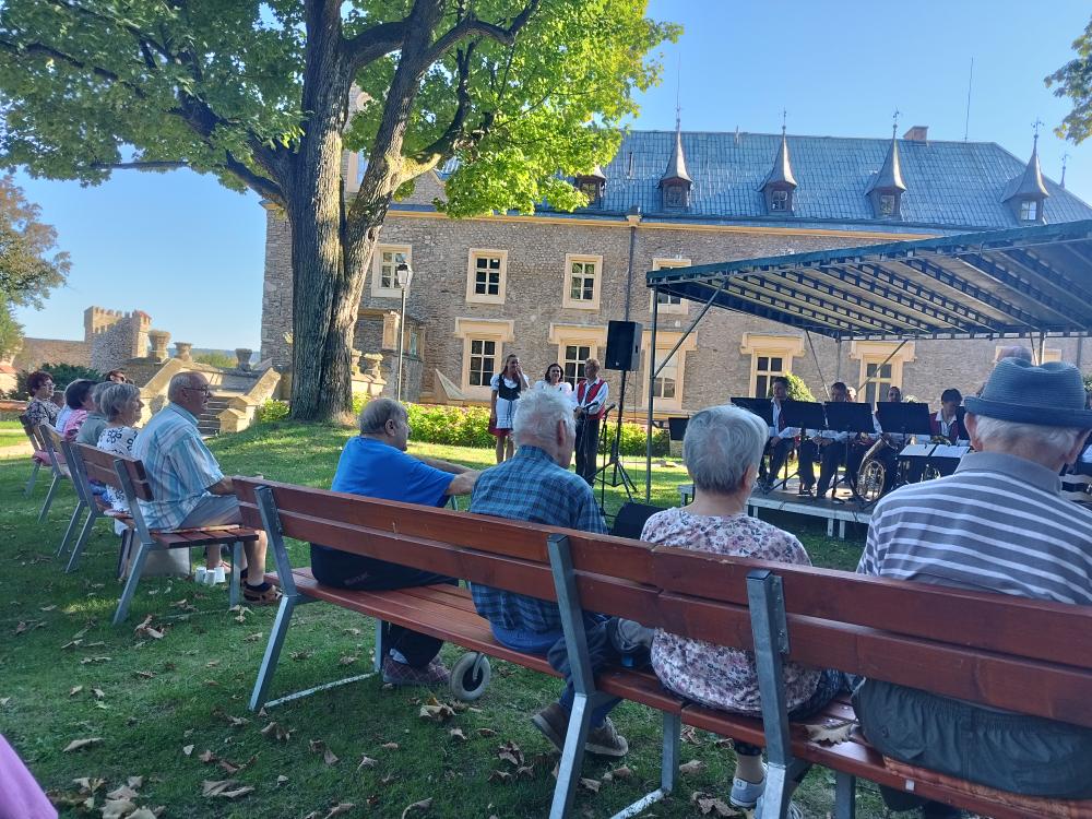 Každým rokem se v létě těšíme na akci, kterou pořádá naše město a to je vystoupení dechové hudby s krásným názvem Křídlovanka. Jsou to již vlastně naši staří známí – poznali jsme je, když nám je před několika lety přivedla Ježíškova vnoučata až k nám do domova. Zjistili jsme, že jsou to úžasní profesionálové, každý z jiného koutu republiky, kteří se občas sejdou a téměř bez jakéhokoli zkoušení zahrají nádherný koncert plný písniček, které si s nimi může zazpívat téměř každý. A tak jsme se stali jejich fanoušky, kteří vždy obsadí přední místa laviček v zámeckém parku a natěšeně vítají kapelu i s jejich hosty. Letos jím byl syn samotného Jaromíra Vejvody. A co je ještě zajímavé? Každému jejich vystoupení vždy přeje počasí, nikdy se nezamračí… tak snad to nezakřikneme!