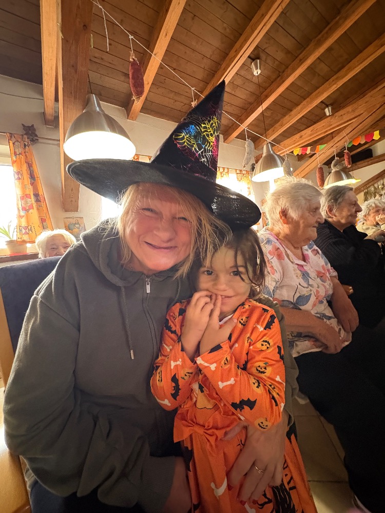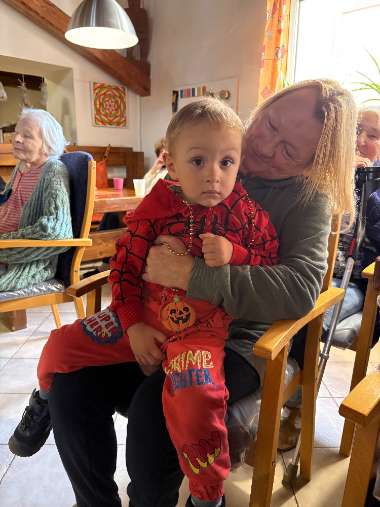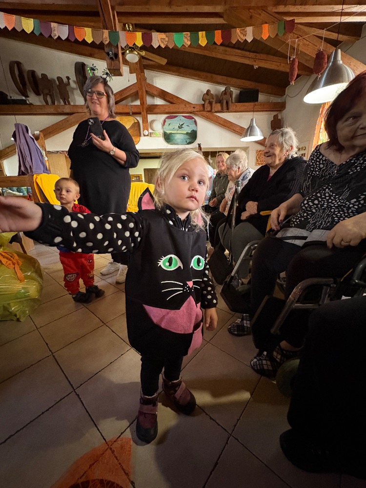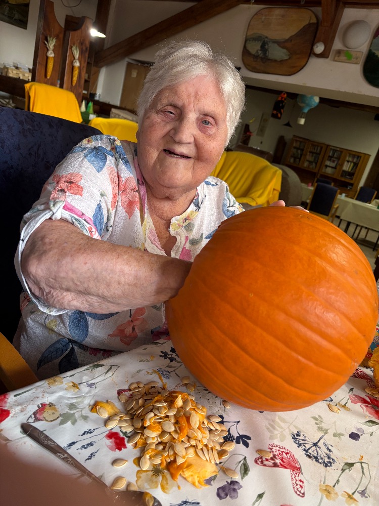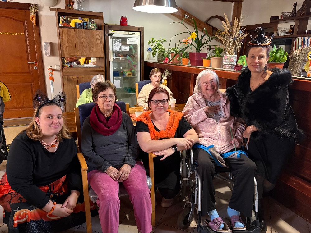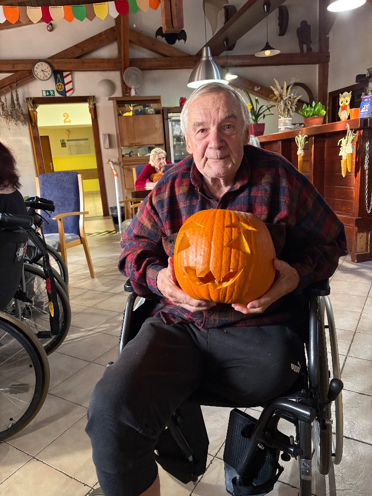 Dnes se uskutečnilo halloweenské mezigenerační setkání, navštívily nás děti z DS Mlýnek. Přišly se nám ukázat v maskách, které měly přichystané. Potkali jsme zde čarodějnou princeznu, kočičku, ale také Spider-Mana. Naše aktivizační pracovnice vyzdobily chodbu oranžovými fáborky, které děti navedly až k nám na aktivizační místnost, kde nám děti ukázaly jejich ranní pozdrav, zahrály si spolu s námi a tetami ze školky zajíčka v své jamce a také si s námi zazpívaly, nakonec jsme si přečetli pohádku o čarodějnici a kouzelné dýni. Některé děti nám půjčily i svoje kloboučky, což nás velice potěšilo. Děti si u nás dokonce vykoledovaly i nějaké ty dobroty a plyšáky. Všichni jsme byli ze setkání nadšeni a těšíme se na další. Odpoledne jsme vydlabávali dýně a pan Karel je všechny nádherně vyřezal, ještě jsme si dali výborné halloweenské muffiny, které jsme dopoledne upekli.