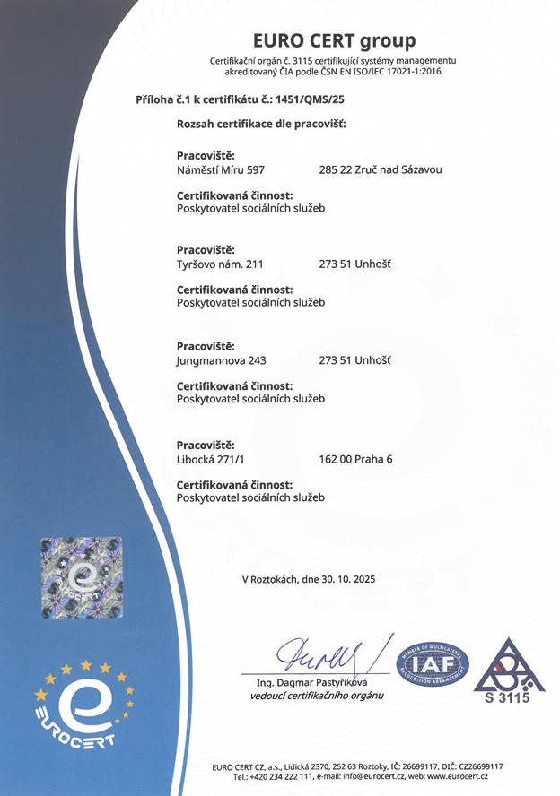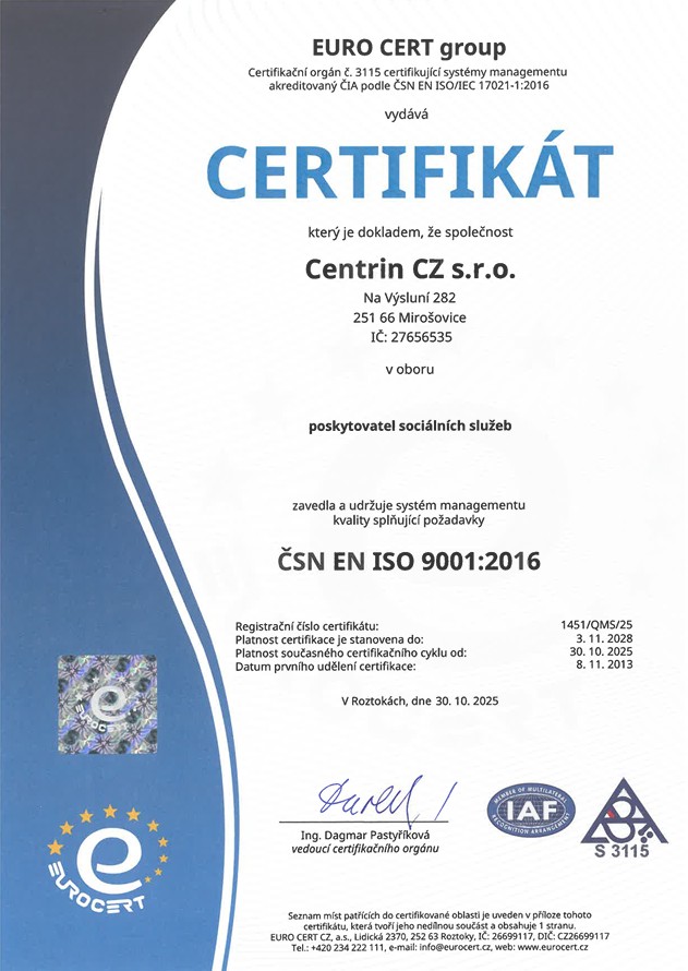 V listopadu 2013 společnost Centrin CZ úspěšně završila proces zavádění systému managementu kvality ISO 9001. Certifikační orgán EURO – CERT při České společnosti pro jakost potvrdil, že společnost Centrin CZ splnila všechny podmínky pro udělení certifikátu shody systému managementu kvality s požadavky ČSN EN ISO 9001 : 2009 pro oblast poskytování sociálních služeb. V listopadu 2016 úspěšně proběhla recertifikace ČSN EN ISO 9001 : 2009. V listopadu 2017 pak znovu úspěšně proběhl přechod na ČNS EN ISO 9001 : 2016. Certifikát z roku 2025 je k náhledu níže, certifikát je možné ověřit ZDE