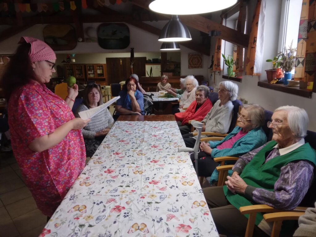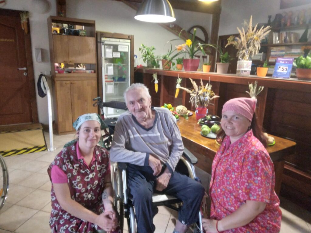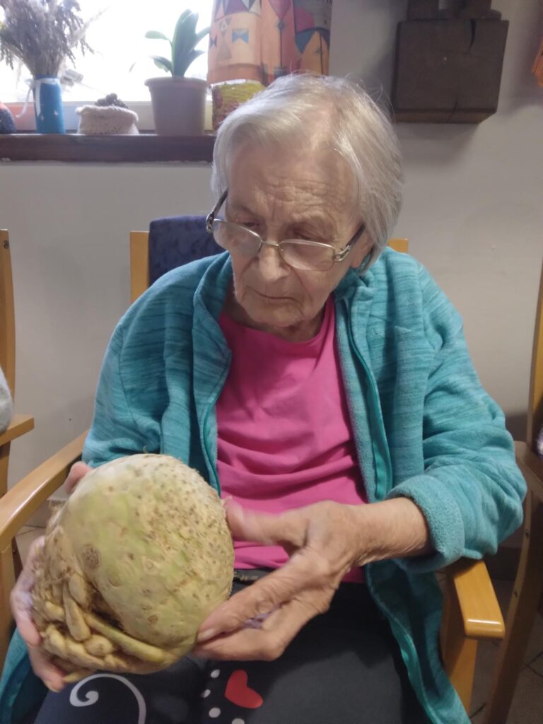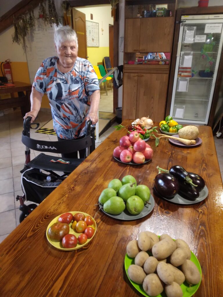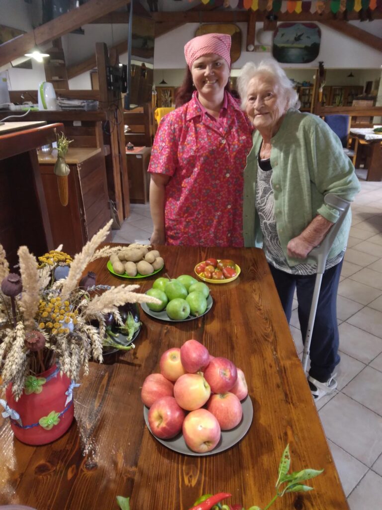Dnes nám začíná podzim a my si to oslavíme sklizní našich plodin. V tento den se začínají krátit dny a prodlužovat noci. Dnes jsme se proto sešli, abychom si takovou podzimní rovnodennost připomněli. Na aktivizaci byly již připraveny všechny plodiny, které jsme během léta vypěstovali. Například jablka, hrušky, rajčata, papriky, lilky, brambory, cibuli, česnek a kořenovou zeleninu, kde jsme měli i velký celer, který jsme si pro zajímavost zvážili. A o ostatních plodech jsme si povyprávěli, co všechno jsme z nich vařili, pekli a zavařovali. Naším dnešním cílem bylo i pečení štrúdlu. Holky z aktivizace nám rozdaly nové škrabky a my začali škrábat jablka. Bohužel nám to nikomu nešlo, protože jsme si nevšimli, že nejsou škrabky ještě rozbalené a mají na sobě ochrannou folii. Když jsme škrabky rozbalili, tak to šlo hned lépe. Loupali jsme, jak o závod. Oloupaná jablka jsme nastrouhali, smíchali s rozinkami a skořicovým cukrem. Zabalili, pomašlovali a dali péct. Ti z nás, na které nezbyla škrabka, dostali nožíky a krájeli pažitku pro naši kuchyni. Odpoledne bylo plné ovoce a zeleniny.