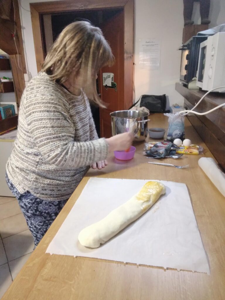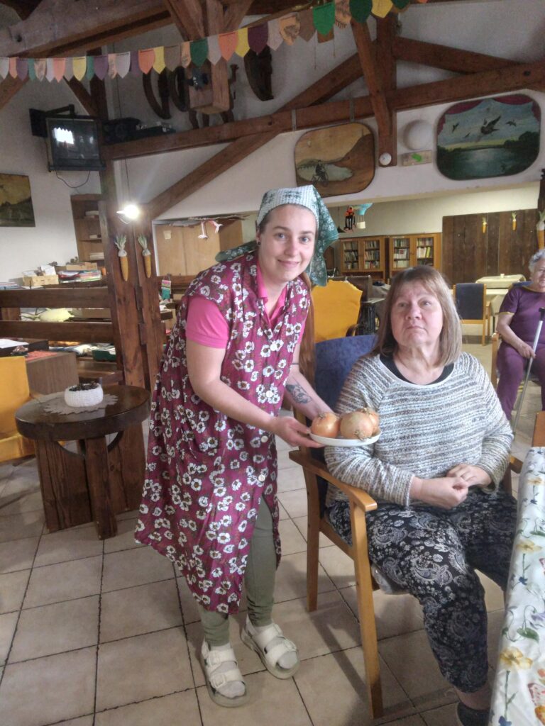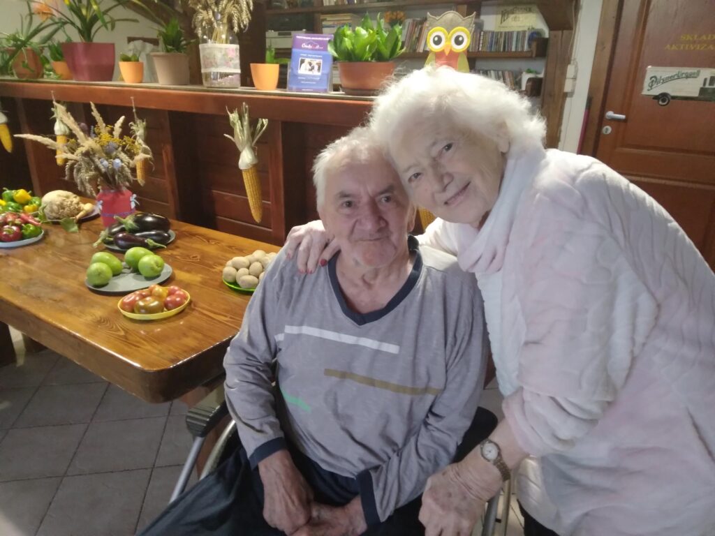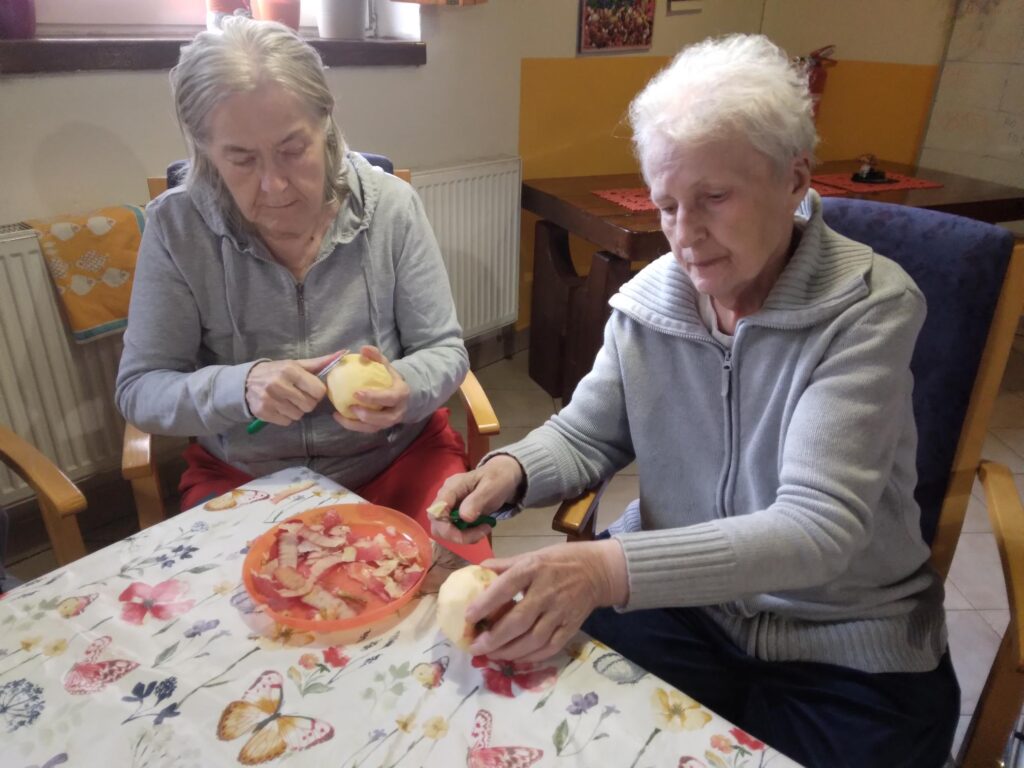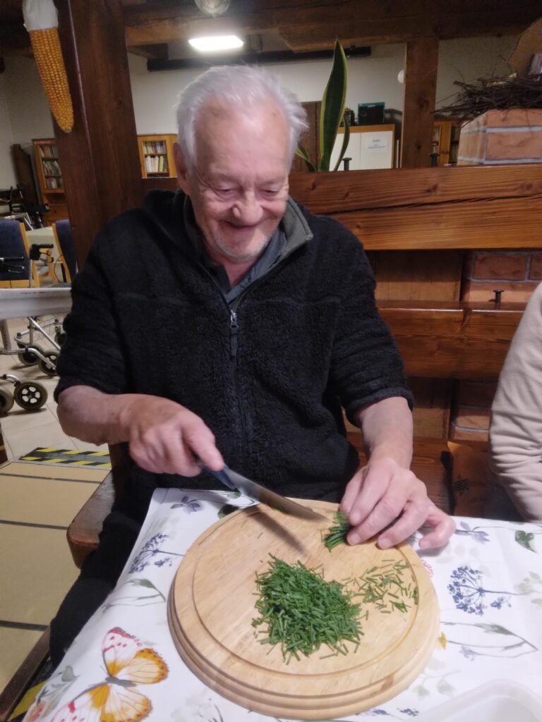 Dnes nám začíná podzim a my si to oslavíme sklizní našich plodin. V tento den se začínají krátit dny a prodlužovat noci. Dnes jsme se proto sešli, abychom si takovou podzimní rovnodennost připomněli. Na aktivizaci byly již připraveny všechny plodiny, které jsme během léta vypěstovali. Například jablka, hrušky, rajčata, papriky, lilky, brambory, cibuli, česnek a kořenovou zeleninu, kde jsme měli i velký celer, který jsme si pro zajímavost zvážili. A o ostatních plodech jsme si povyprávěli, co všechno jsme z nich vařili, pekli a zavařovali. Naším dnešním cílem bylo i pečení štrúdlu. Holky z aktivizace nám rozdaly nové škrabky a my začali škrábat jablka. Bohužel nám to nikomu nešlo, protože jsme si nevšimli, že nejsou škrabky ještě rozbalené a mají na sobě ochrannou folii. Když jsme škrabky rozbalili, tak to šlo hned lépe. Loupali jsme, jak o závod. Oloupaná jablka jsme nastrouhali, smíchali s rozinkami a skořicovým cukrem. Zabalili, pomašlovali a dali péct. Ti z nás, na které nezbyla škrabka, dostali nožíky a krájeli pažitku pro naši kuchyni. Odpoledne bylo plné ovoce a zeleniny.