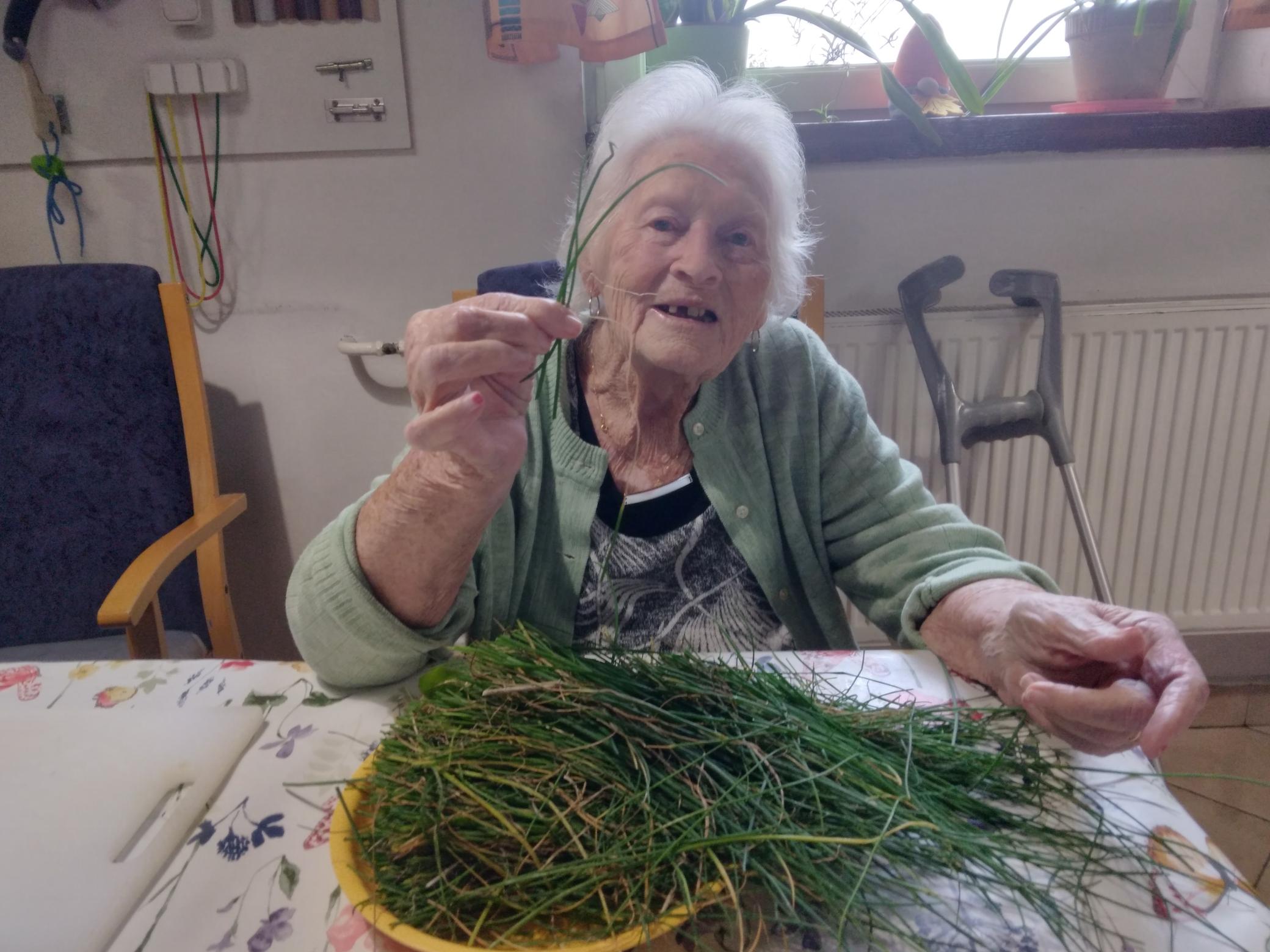 Dnes nám začíná podzim a my si to oslavíme sklizní našich plodin. V tento den se začínají krátit dny a prodlužovat noci. Dnes jsme se proto sešli, abychom si takovou podzimní rovnodennost připomněli. Na aktivizaci byly již připraveny všechny plodiny, které jsme během léta vypěstovali. Například jablka, hrušky, rajčata, papriky, lilky, brambory, cibuli, česnek a kořenovou zeleninu, kde jsme měli i velký celer, který jsme si pro zajímavost zvážili. A o ostatních plodech jsme si povyprávěli, co všechno jsme z nich vařili, pekli a zavařovali. Naším dnešním cílem bylo i pečení štrúdlu. Holky z aktivizace nám rozdaly nové škrabky a my začali škrábat jablka. Bohužel nám to nikomu nešlo, protože jsme si nevšimli, že nejsou škrabky ještě rozbalené a mají na sobě ochrannou folii. Když jsme škrabky rozbalili, tak to šlo hned lépe. Loupali jsme, jak o závod. Oloupaná jablka jsme nastrouhali, smíchali s rozinkami a skořicovým cukrem. Zabalili, pomašlovali a dali péct. Ti z nás, na které nezbyla škrabka, dostali nožíky a krájeli pažitku pro naši kuchyni. Odpoledne bylo plné ovoce a zeleniny.