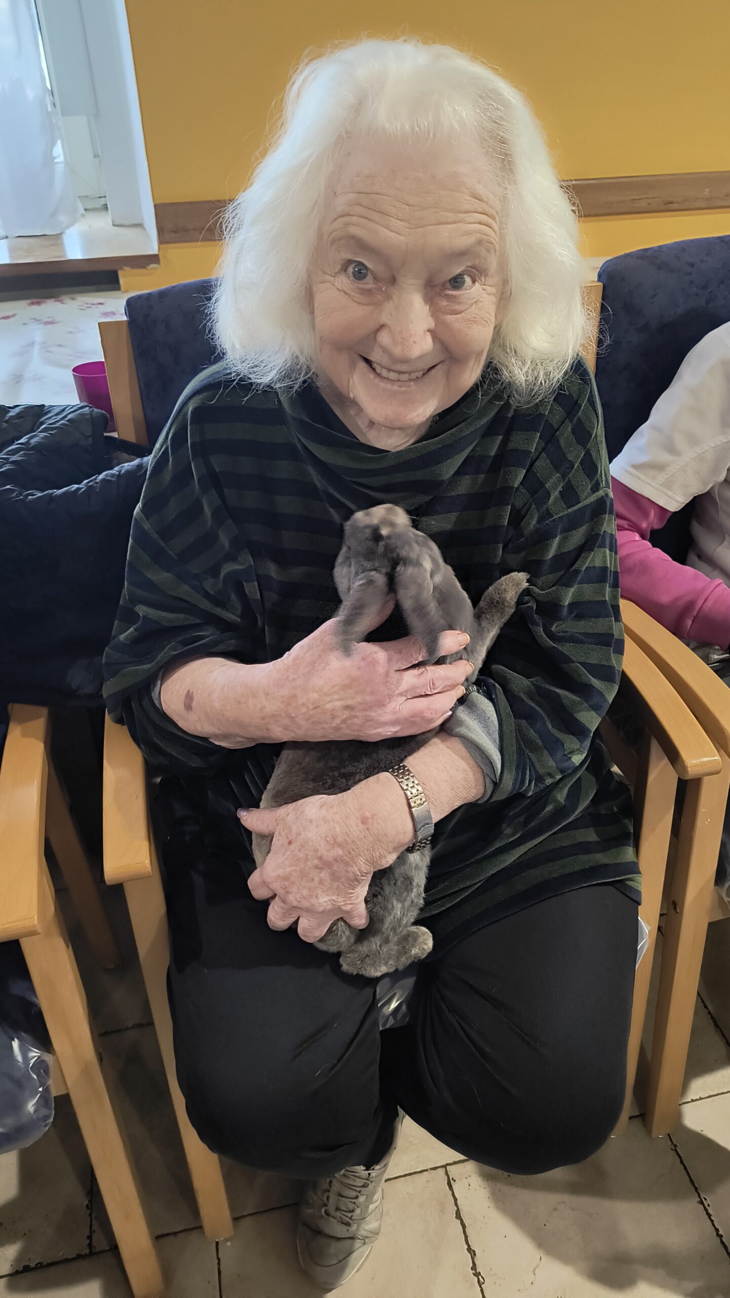 Králičí hop je sportovní disciplína, kdy závodí člověk se svým králíkem. Králík skáče přes překážky do výšky i do dálky a dnes jsme mohli sledovat jejich trénink přímo u nás v domově. Bylo toho spousty k vidění – překážky, bedýnky, postroje a hlavně králíci. Jeden bílý, jeden černý, šedý, hnědý, strakatý a všichni hebcí. My byli nadšeni, jelikož jsme si mohli králíky i hladit a mazlit se s nimi. Králíci, kteří zrovna nebyli na dráze a nepracovali se svými páníčky, tak pobíhali okolo nás. Někteří byli natolik zvědaví a odvážní, že si pro pohlazení přišli sami. Zvedali se na zadní nožičky a koukali po nás. O této disciplíně někteří z nás neměli ani tušení a tak majitelé králíčků odpovídali na naše dotazy a vyprávěli nám, co vše je potřeba k chovu a výcviku. Skupina, která za námi přijela, se jmenuje Hopáci z Braníka a trénují spolu již deset let. My jim za tuto nevšední podívanou mnohokrát děkujeme. Přijeďte zas!