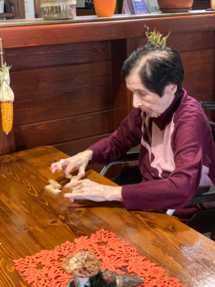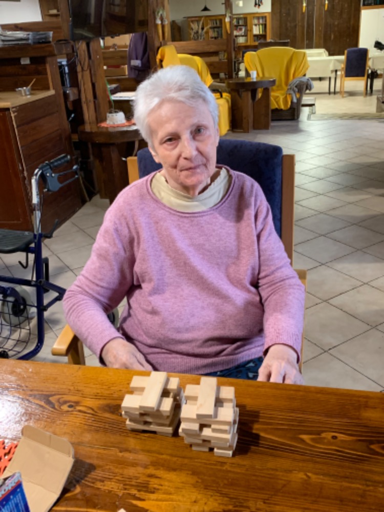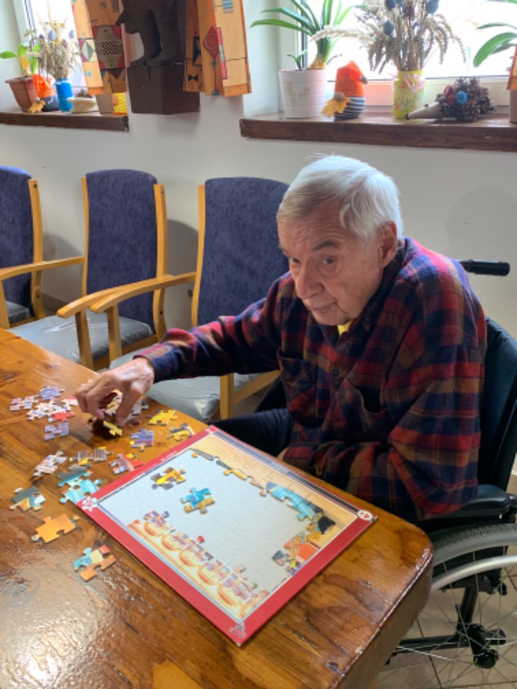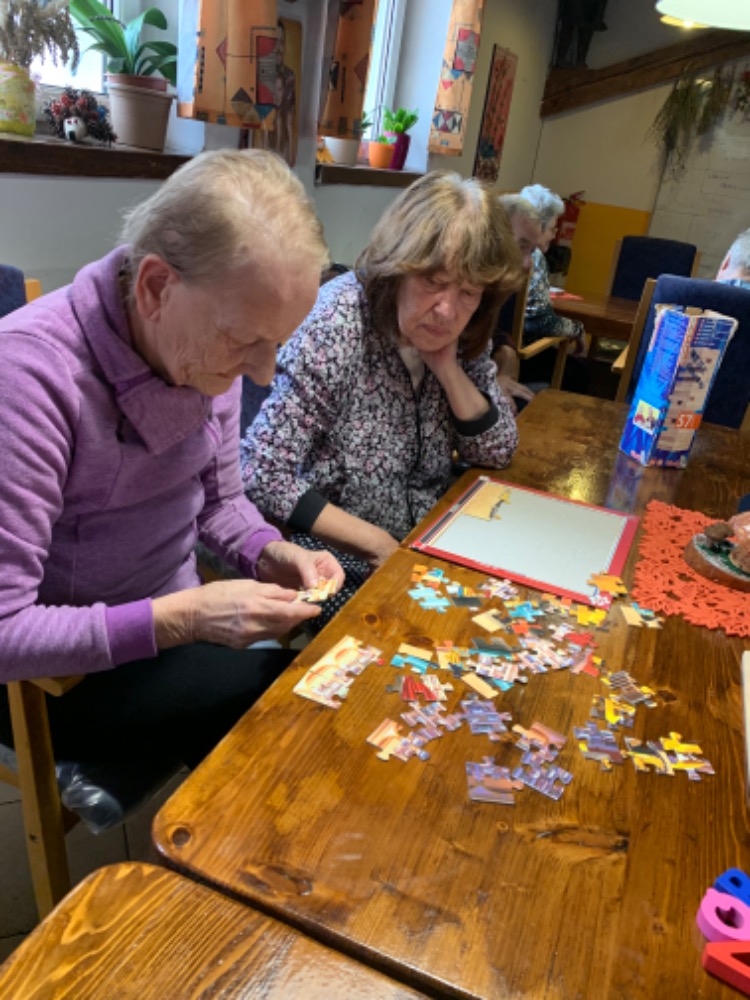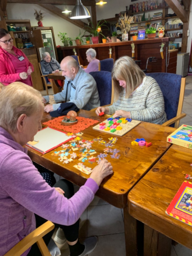 Dnes máme středu a my jsme se opět sešli na aktivizační místnosti při společenských hrách. Máme tu ženy, které si užívají hraní žolíků. Vždy se do toho tak zaberou, že si ani nevšimnou, že se blíží konec. Rády hrají do poslední chvíle. Holky z aktivizace nám tentokrát připravily různé stolní hry včetně skládání puzzle. Lámali jsme si hlavy nad těmito obrázky, ale měli jsme k tomu velkou pomoc a podporu od pana Karla. Poté jsme si dali soutěž ve skládání komínů z kostek. Zkoušeli jsme, kdo bude mít komín vyšší a rychleji postavený. V duchu jsme doufali, že komín spadne sousedovi o trochu dříve než nám. Také jsme si zahráli člověče nezlob se, byla to dlouhá a napínavá hra. Dlouho jsme čekali než nám padne šestka, abychom mohli nasadit. Pak jsme se navzájem vyhazovali a znesnadňovali hru jeden druhému. Přece nedáme soupeři výhru zadarmo. Nakonec se nám to povedlo dohrát, ale bylo to opravdu náročné. Jsme soutěživá parta a vždy se moc těšíme na další společenské hry a hlavně na to, co si zase zahrajeme.