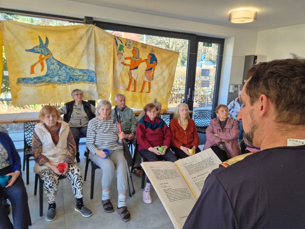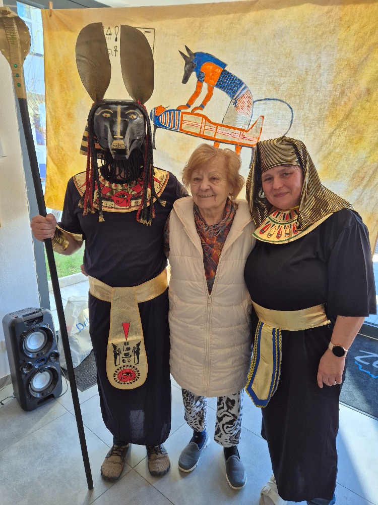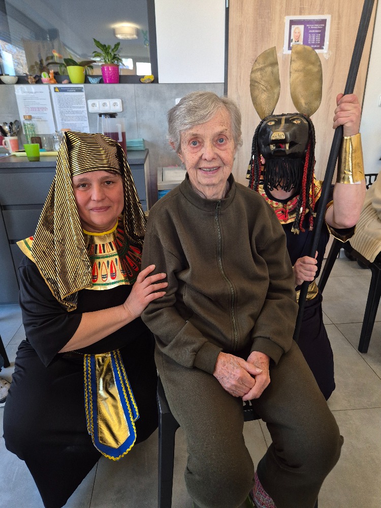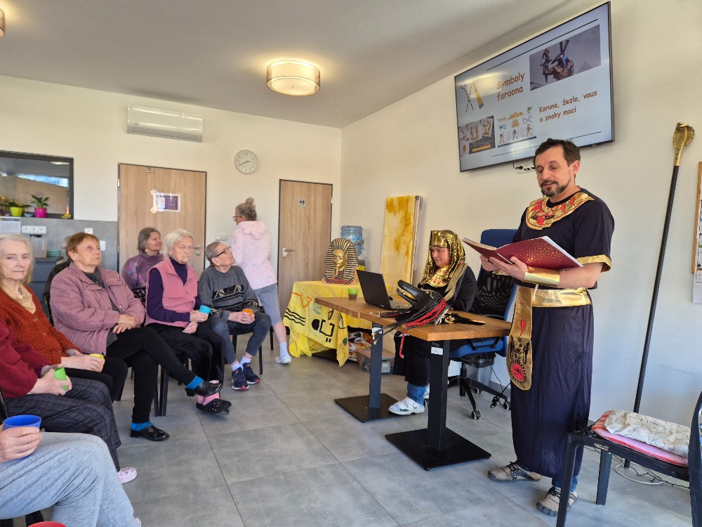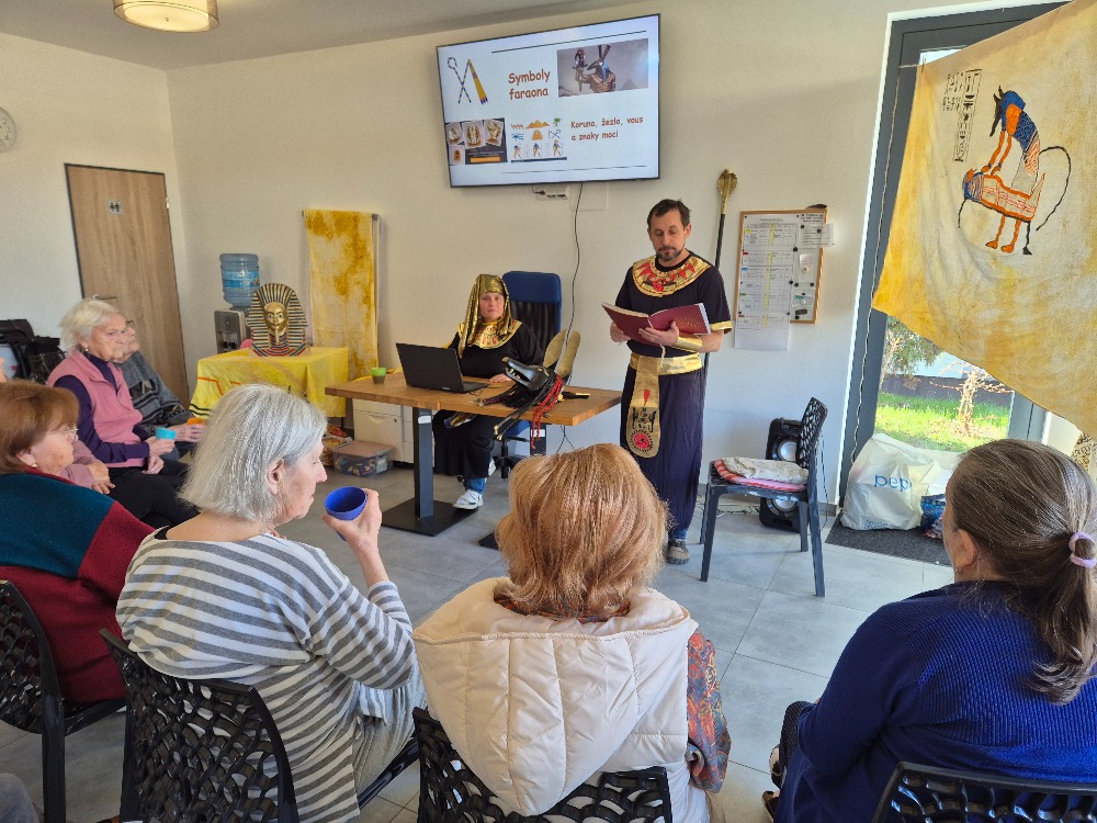 Dnešní společné setkání v našem domově nás přeneslo do dávných časů starověkého Egypta. Poslouchali jsme poutavé vyprávění o zemi, kde vznikla jedna z nejstarších civilizací světa. Dozvěděli jsme se, jak důležitou roli hrála řeka Nil, bez které by život v této oblasti nebyl možný. Zaujaly nás příběhy o faraonech, pyramidách i tajemném posmrtném životě, ve který Egypťané pevně věřili. Velký obdiv v nás vzbudily monumentální stavby, zejména pyramidy a sfinga, a také umění mumifikace. Zajímavé byly i informace o bozích, hieroglyfech a každodenním životě obyčejných lidí. Nejvíce nás ale zaujal příběh mladého faraona Tutanchamona a objev jeho hrobky plné pokladů. Celé vyprávění bylo velmi poutavé, srozumitelné a obohacující. Všichni jsme poslouchali s velkým zájmem a nadšením. Atmosféra byla příjemná a mnozí z nás se aktivně zapojovali do diskuze. Odcházeli jsme s pocitem, že jsme se nejen něco nového naučili, ale také si společně užili krásný a inspirativní čas.