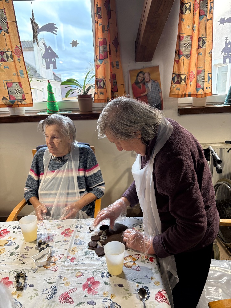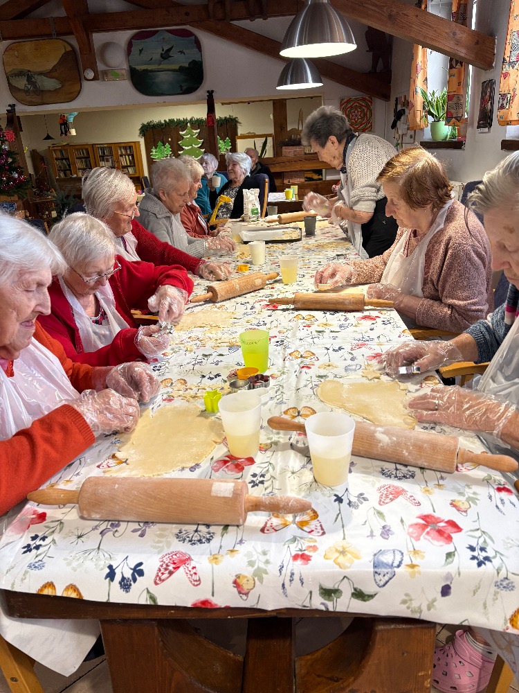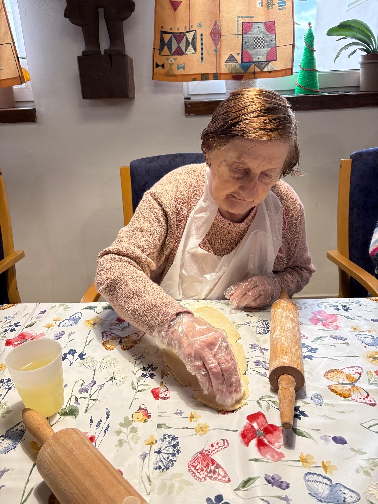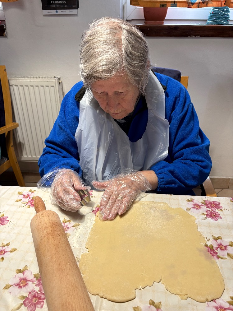 Kouzelnou tradicí pro nás stále zůstává vánoční pečení. Na aktivizační místnosti jsme se dnes sešli, abychom se podíleli na přípravách na Vánoce a pečení je jedna z nich. Stoly nachystané, těsta i válečky leží na nich a nám už jen zbývá vyhrnout si rukávy a umýt si ruce. Jdeme na to! Jedna válí, druhá vykrajuje, třetí dává na plech a co z toho bude? Ano, začali jsme lineckým cukrovím. Potom jsme pokračovali vykrajováním z kakaového těsta a dnešní den jsme zakončili tvořením rohlíčků. Můžeme i říct, že rohlíčky nám daly zabrat, mnohdy to vypadalo jako modelářská práce. V průběhu týdne budeme ještě mazat džemem a zdobit čokoládou. U nás už nejde o recepty či tvoření něčeho nového, ale o vzpomínku na nezapomenutelné chvíle s rodinou. Přejeme vám krásný a klidný čas předvánoční.