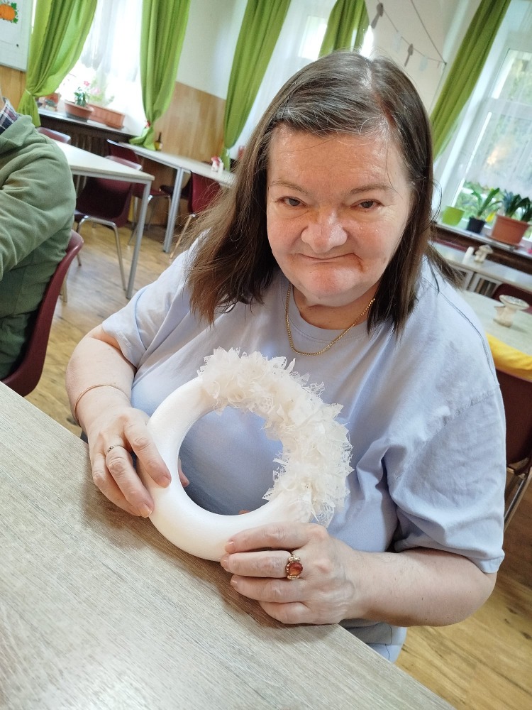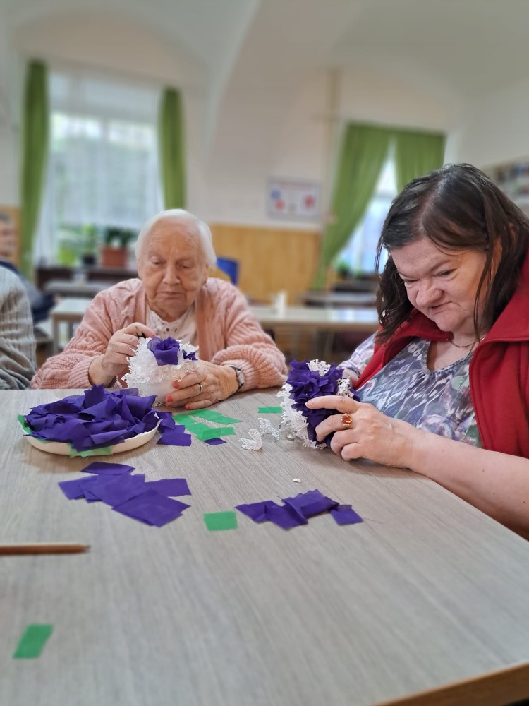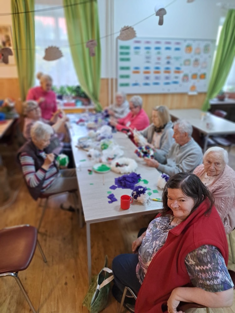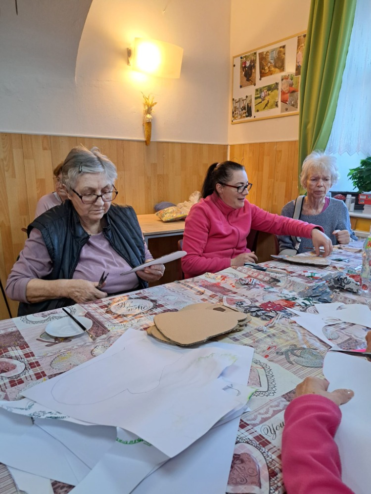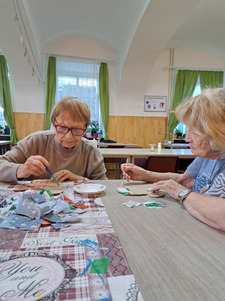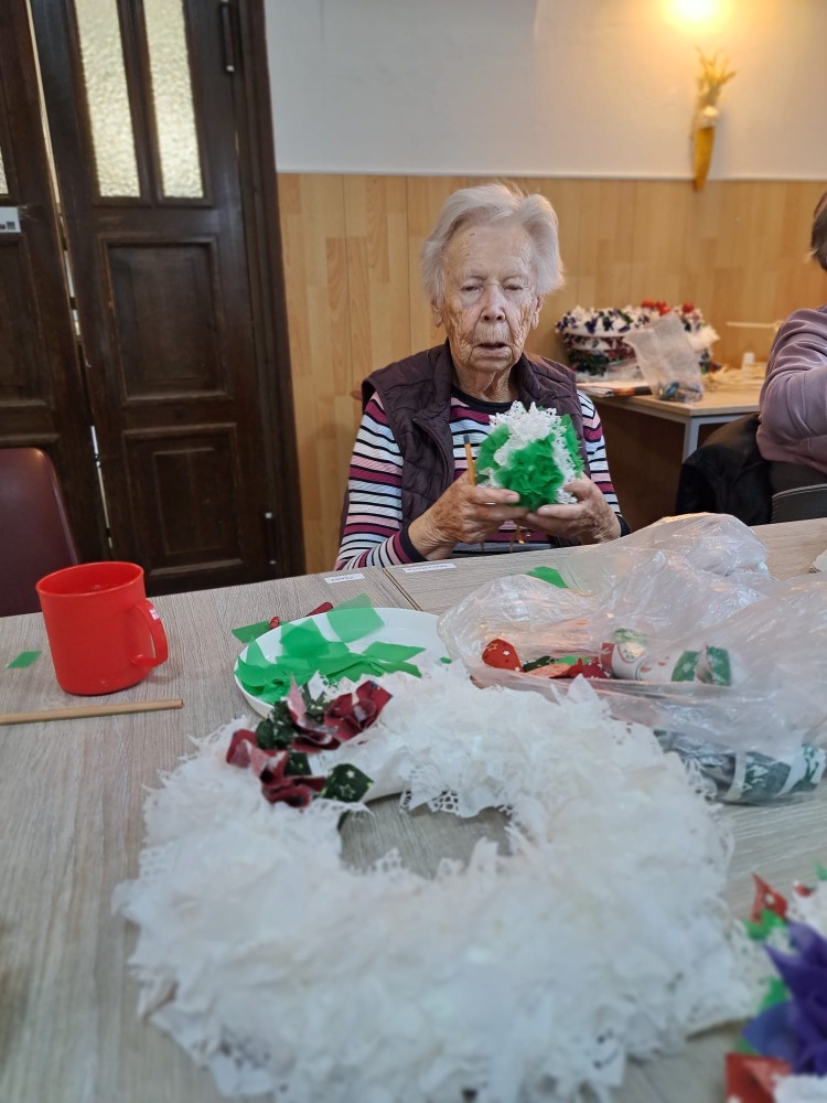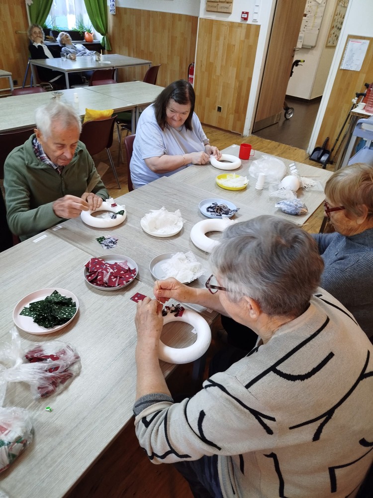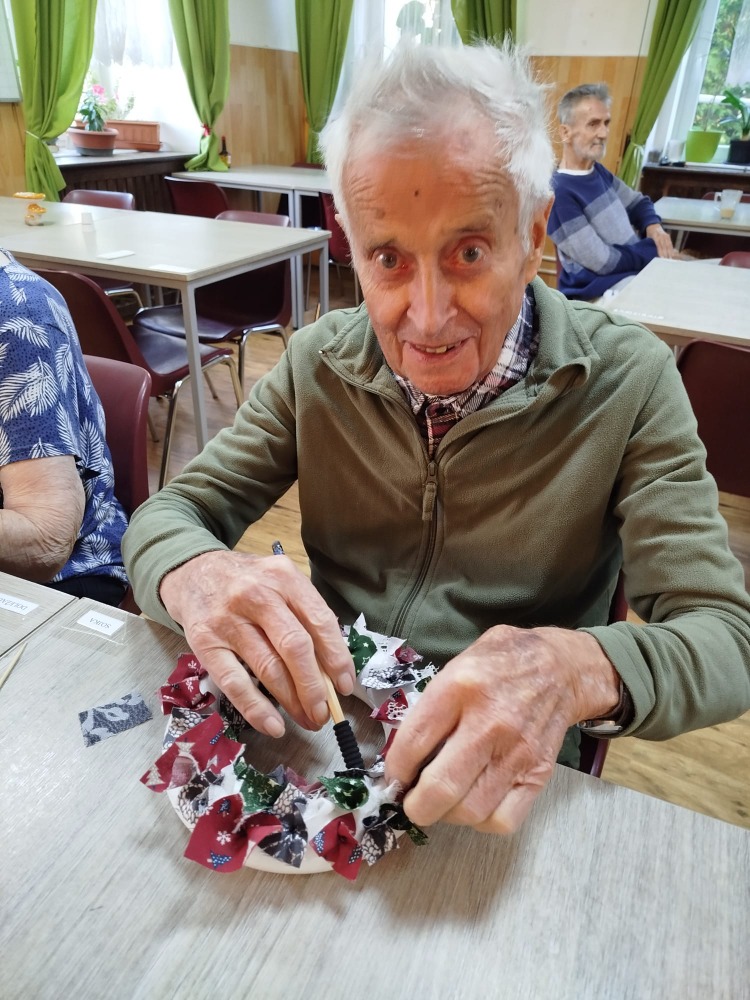 Vánoční přípravy vrcholí, a tak v těchto dnech odpolední čas v našem domově patřil pravidelně vánočnímu tvoření. Vždy jsme se sešli v jídelně nebo v altánu, podle počasí, kde na nás čekal připravený materiál a ukázka výrobku, který se bude vyrábět: např. stromečky, věnce, hvězdy a další. Vždy jsme si u toho povídali o Vánocích, jaké dárky jsme dostávali, o vánočních tradicích a jak kdo prožíval Vánoce. Poslouchali jsme písničky a koledy a také jsme si pustili vánoční pohádku, u které se nám občas sice začaly zastavovat ruce, ale i tak nám práce šla od ruky a hotové výrobky vyskakovaly jeden za druhým. Týden tvoření nám rychle utekl a my nejen, že jsme měli dobrý pocit z dobře odvedené práce, ale i jsme se dozvěděli nové zajímavé věci spojené s Vánocemi. Byla to moc milá, zábavná odpoledne, společně prožité chvilky, na které budeme vzpomínat a už teď se těšíme na další větší tvoření. Jsme okouzleni, že vánoční atmosféru si dokážeme vytvořit i my sami u nás v domově.